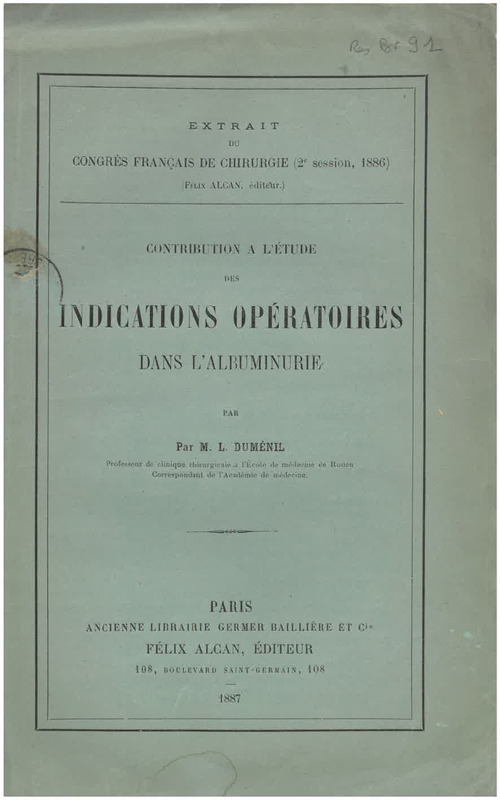 Extrait du congrès français de chirurgie sur les indications opératoires dans l'albuminurie par le docteur Duménil, professeur de la clinique chirurgicale à l’École de médecine de Rouen.