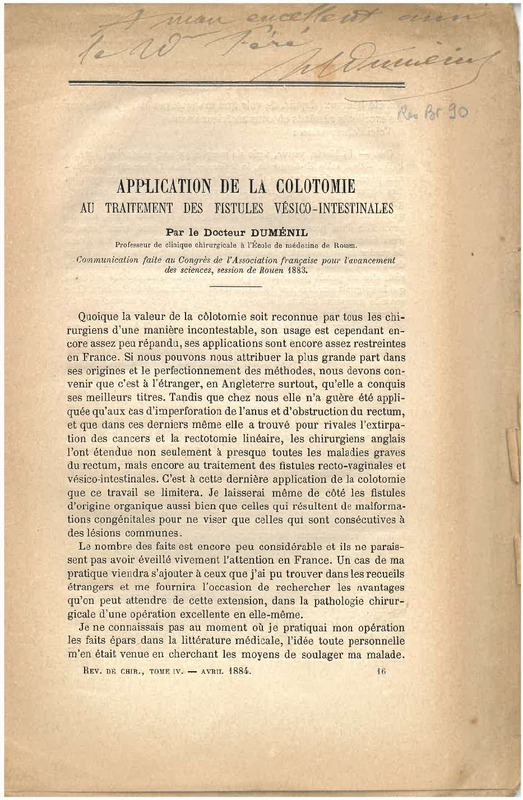 Extrait de la revue de chirurgie sur l'application de la colotomie au traitement des fistules vésico-intestinales par le docteur Duménil, professeur de la clinique chirurgicale à l’École de médecine de Rouen. C'est une communication faite lors du Congrès de l'Association française pour l'avancement des sciences à Rouen en 1883.