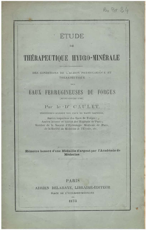 Extrait des Annales de la société d'hydrologie médicale de Paris à propos des conditions de l'action physiologique et thérapeutique des eaux ferrugineuses de Forges par le Docteur Caulet, ancien inspecteur des Eaux de Forges-les-Eaux.