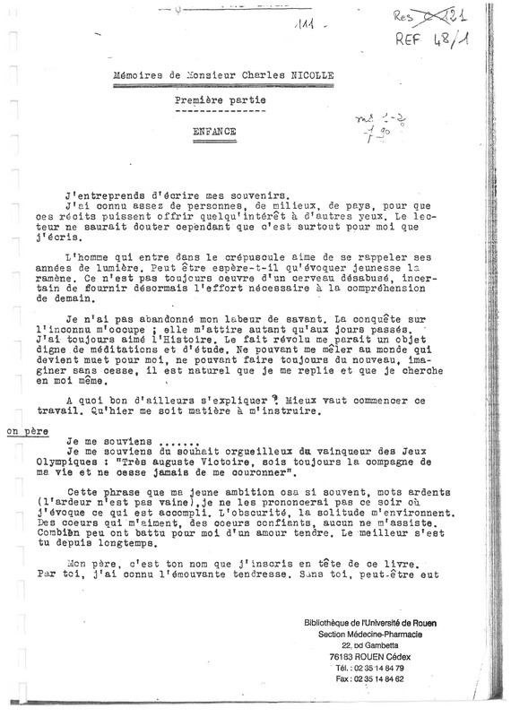 Portail général (). Mémoires de Monsieur Charles Nicolle. https://frea.univ-rouen.fr/s/frea/item/1298
