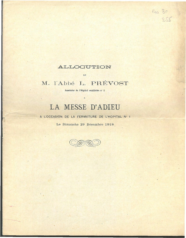 Allocution.de M. L'Abbé L. Prévost [...] à la messe d'adieu à l'occasion de la fermeture de l'hôpital n° 1, le Dimanche 29 décembre 1918
