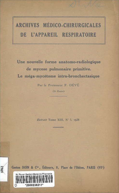 Extrait des archives médico-chirurgicales de l'appareil respiratoire à propos de la nouvelle fome anatomo-radiologique de mycose pulmonaire primitive par le Professeur Félix Dévé, docteur normand. Il y a un dédicace au medecin rouennais Louis Née (1881-19..)