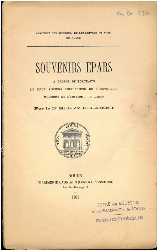 Portail général (). Souvenirs épars : à propos de portraits de deux chirurgiens de l'Hôtel-Dieu, membres de l'Académie de Rouen. https://frea.univ-rouen.fr/s/frea/item/1387