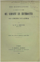 Extrait des archives de physiologie d'octobre 1894 sur les modifications de nombre et de volume que subissent les érythrocytes sous l'influence de l'altitute par le Dr A. Mercier (De Zurich). Ce l...